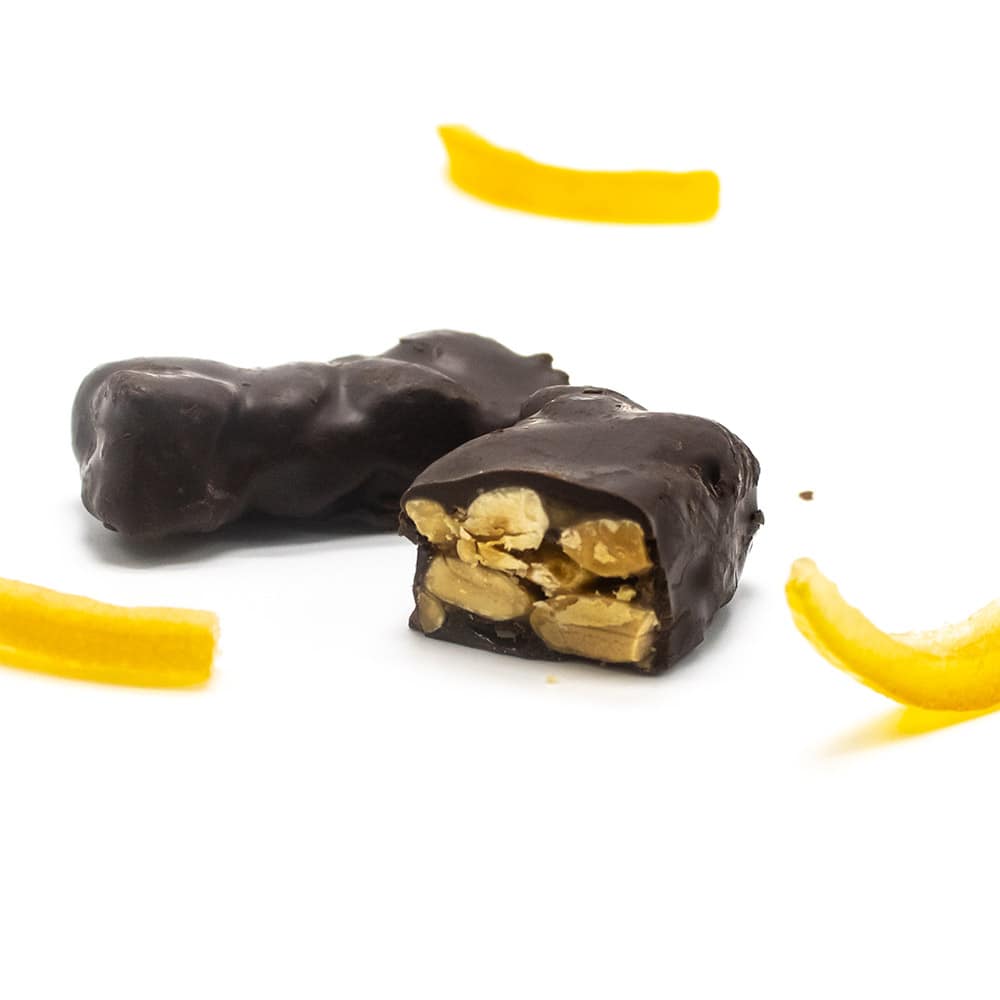 Torrone di Mandorla all’Arancia ricoperto da squisito cioccolato fondente. Questo torroncino artigianale calabrese conquista i palati grazie al particolare profumo agrumato che gli regala la scorza di arancia.